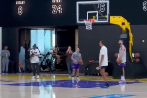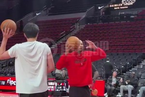 今天迎戰聯盟第一的雷霆!楊瀚森賽前和助教練習籃下卡位,以及搶板終結得分!