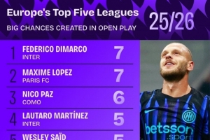 體育資訊10月9日訊 Squawka統計了球員本賽季在五大聯賽運動戰中創造重大機會的次數,并列出榜單,迪馬爾科、洛佩斯7次居首,尼科-帕斯6次第三。