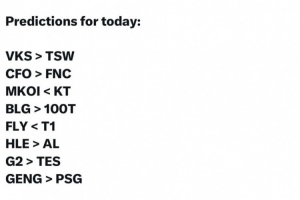 VKS戰(zhàn)勝TSW、CFO戰(zhàn)勝FNC、KT戰(zhàn)勝MKOI、HLE戰(zhàn)勝AL、BLG戰(zhàn)勝100T、G2戰(zhàn)勝TES、T1戰(zhàn)勝FLY、GEN戰(zhàn)勝PSG。