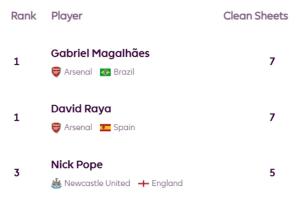 英超前十輪零封榜:拉亞、加布7次霸榜,薩利巴、廷伯、波普5次