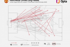 據(jù)Opta統(tǒng)計(jì),曼聯(lián)本場比賽傳球294次,其中有75次長傳,占比25.5%、2017年12月3-1擊敗阿森納(占比27.9%)之后,這是曼聯(lián)在英超長傳占比最高的比賽。