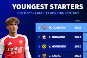 體育資訊10月30日訊 據英國轉會市場的統計,昨晚,馬克斯·道曼代表阿森納在英格蘭聯賽杯對陣布萊頓的比賽中首發,成為本世紀歐洲五大聯賽俱樂部最年輕的首發球員。