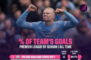 體育資訊10月31日訊 Opta統(tǒng)計(jì)了球員單賽季英超進(jìn)球在球隊(duì)的占比,并列出榜單,本賽季哈蘭德占比64.7%最高。