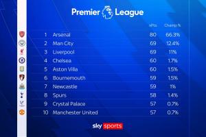 根據Opta目前的最新預測,如果阿森納及其爭冠對手繼續這樣踢下去,那么槍手只需70分即可奪冠。