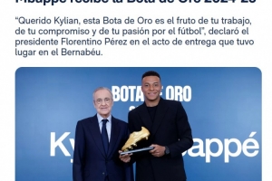 在這里,你正穿著你如此渴望的白色球衣,書(shū)寫著你自己的歷史。我們的球迷崇拜你,并將在每一次挑戰(zhàn)中陪伴你。親愛(ài)的姆巴佩,這座金靴獎(jiǎng)對(duì)你來(lái)說(shuō)是繼續(xù)贏下去、繼續(xù)為皇家馬德里的偉大歷史做出貢獻(xiàn)的又一動(dòng)力。