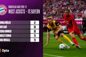 據(jù)OptaFranz的數(shù)據(jù)統(tǒng)計(jì),自2020年轉(zhuǎn)會(huì)拜仁以來,薩內(nèi)在德甲聯(lián)賽中送出39次助攻,同期僅次于托馬斯-穆勒(57次),領(lǐng)先于科曼和穆西亞拉。