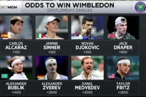 體育資訊6月30日訊 溫網今天將展開爭奪,在男單奪冠賠率榜上,阿爾卡拉斯排名第一,辛納排名第二,德約科維奇排名第三,小茲維列夫排名第六。