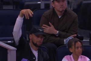 此役,勇士球星庫里攜二女兒萊恩現場觀戰,并在鏡頭前互動。