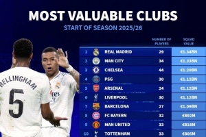 體育資訊7月3日訊 德國轉會市場列出了俱樂部球員總身價排名,皇馬13.4億歐居首,曼城、切爾西二三位。