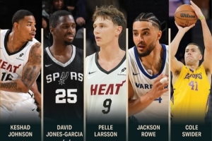 入選最佳陣容的5名球員分別是凱沙德-約翰遜(熱火)、大衛(wèi)-瓊斯-加西亞(馬刺)、佩勒-拉松(熱火)、杰克遜-羅(勇士)、科爾-斯威德(湖人)。5名球員里,佩勒-拉松是去年的44號(hào)秀,其他4人都是落選秀。