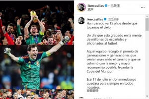 體育資訊7月11日訊 西班牙傳奇門將卡西更新社媒動態,回顧15年前的今天贏得世界杯冠軍