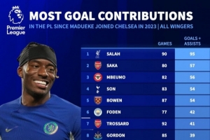 德轉列馬杜埃凱加盟藍軍后英超邊鋒同期直接參與進球榜: