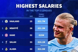 五大聯(lián)賽年薪排名:哈蘭德3170萬歐居首,姆巴佩、凱恩二三位