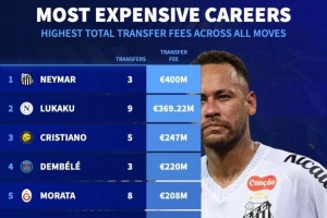 體育資訊7月22日訊 德國轉會市場統計了球員生涯總轉會費,并列出榜單,內馬爾居首,盧卡庫、C羅排名二三位。