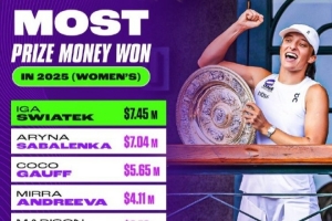 斯瓦泰克本賽季取得了745萬美元的獎金排名第一,薩巴倫卡704萬美元排名第二,高芙565萬美元排名第三,中國選手鄭欽文無緣該榜單前十。