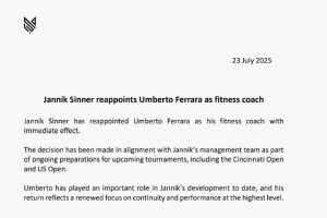 體育資訊7月23日訊 現男子網球世界第一辛納團隊發表聲明,體能師翁貝托-費拉拉回歸團隊,原來的體能師帕尼奇將加入魯內團隊。