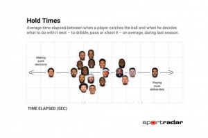 體育資訊8月11日訊?數(shù)據(jù)專家Todd Whitehead統(tǒng)計了上賽季,進(jìn)攻發(fā)起者在接到球之后,做出下一步行動(運(yùn)球、傳球或投籃)所用的平均時間,具體如圖。