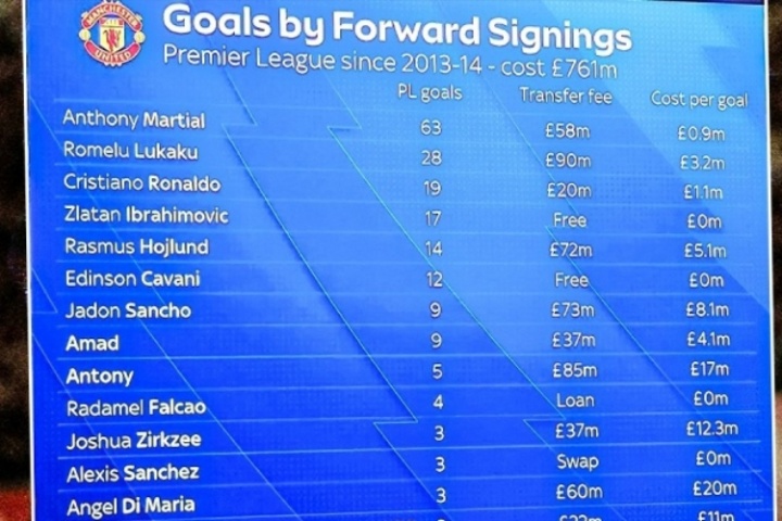 自13/14賽季以來,曼聯花費7.61億鎊簽了14名前鋒,一共攻入191粒英超進球。而薩拉赫2017年加盟利物浦,他至今已經攻入了187粒英超進球。