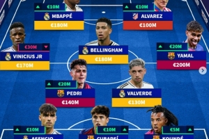中場:維尼修斯(皇馬,1.7億歐)、佩德里(巴薩,1.4億歐)、貝林厄姆(皇馬,1.8億歐)、巴爾韋德(皇馬,1.3億歐)、亞馬爾(巴薩,2億歐)