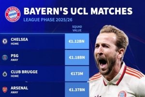 體育資訊8月29日訊 本賽季歐冠聯(lián)賽階段對陣抽簽結(jié)果出爐,德國轉(zhuǎn)會市場盤點(diǎn)了拜仁對手的身價(jià)。