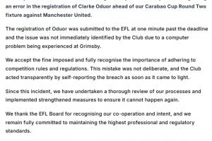 奧多的注冊在截止時間后一分鐘提交給EFL,由于格林斯比的電腦問題,俱樂部未能立即發現該問題。我們接受所施加的罰款,并完全認識到遵守比賽規則和規定的重要性。這一錯誤并非故意,俱樂部在發現違規后立即主動報告。