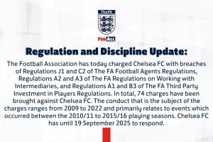 英格蘭足球總會今日對切爾西足球俱樂部提出指控,其違反《英足總足球經紀人條例》J1和C2條款、《英足總中介合作條例》A2和A3條款,以及《英足總第三方球員投資條例》A1和B3條款。切爾西俱樂部共面臨74項指控,涉及2009年至2022年期間的違規行為,主要集中于2010/11至2015/16賽季期間。切爾西俱樂部需于2025年9月19日前就此作出回應。