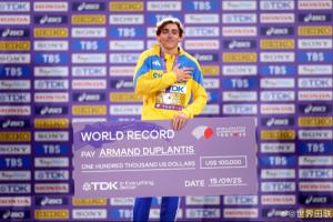 杜普蘭蒂斯成為2025年東京田徑世錦賽第一個帶著“世界紀錄”號碼牌上臺領獎的選手,也獲得了10萬美元的世界紀錄獎金。