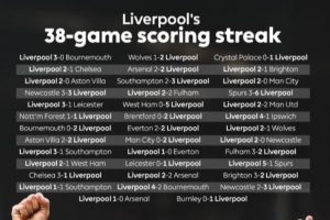 體育資訊9月16日訊 根據(jù)英超官方統(tǒng)計(jì),利物浦連續(xù)38場聯(lián)賽取得進(jìn)球。