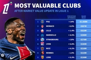 法甲球隊身價排行(括號內為更新后變化幅度):