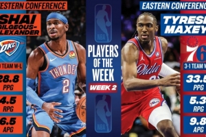 周最佳出爐:SGA率隊(duì)4-0場均攬28.8分 馬克西場均轟33.5分9.8助