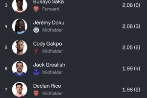本賽季英超預期助攻排名:姆伯莫2.52次居首,恩迪亞耶、薩卡前三
