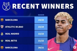 德轉(zhuǎn)列近10年國王杯冠軍:巴薩5次登頂,皇馬僅在2023年奪冠